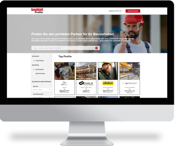 Mit den neuen Firmenprofilen schaffen wir digitale Sichtbarkeit und Branchenvernetzung für Unternehmen wie Ihres. In Form einer eigenen, professionellen Website präsentieren Sie Ihre Firma auf baublatt.ch und/oder batimag.ch – direkt eingebunden in das redaktionelle Umfeld, das von Entscheidungsträgern in der Bauwirtschaft täglich genutzt wird. Und das bieten wir Ihnen:
