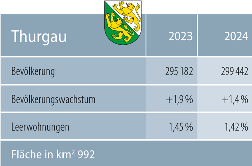 Die Thurgauer Wohnbevölkerung wuchs 2024 um 1,3 Prozent. Damit lag der Kanton über dem Landesdurchschnitt von 1,0 Prozent. Doch auch das Defizit in der Staatsrechnung erreichte eine beträchtliche Höhe. Die «Thurgauer Zeitung» stufte die 121,7 Millionen Franken Minus gar als «schlechteste Rechnung der Geschichte» ein. Durch den zweiten negativen Abschluss in Folge schmolz das Nettovermögen von 671 Millionen Franken per Ende 2022 auf 298 Millionen. Durch die vom kantonalen Souverän beschlossene Abschaffung der Liegenschaftssteuer fällt in Zukunft eine weitere Einnahmenquelle weg. Für einen Lichtblick sorgte dafür die Schweizerische Nationalbank: Nach zwei Jahren ohne Ausschüttung beteiligt sie den Bund und die Kantone heuer wieder an ihrem Gewinn. Von insgesamt 3 Milliarden Franken fliessen 66 Millionen in den Thurgau.